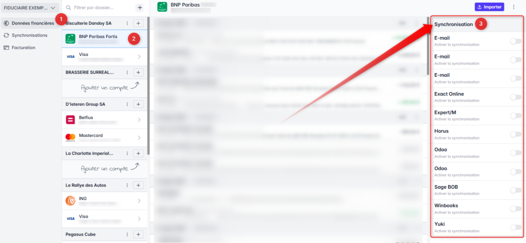 - Dans le panneau latéral qui apparaît à droite, activez la synchronisation avec le logiciel désiré. Vous pouvez avoir plusieurs synchronisations en parallèle pour la même donnée financière.