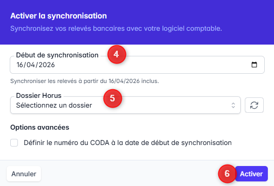 - Si vous choisissez une date dans le futur, la synchronisation commencera à envoyer des CODA à partir de cette date future.
