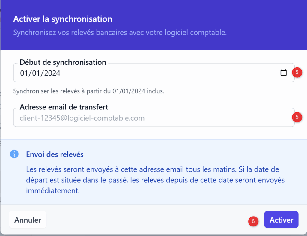 - Si vous choisissez une date dans le futur, la synchronisation commencera à envoyer des CODA à partir de cette date future.