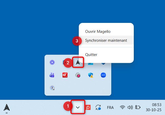 Faites un clic droit sur l’icône Magello et sélectionnez “Synchroniser maintenant”.