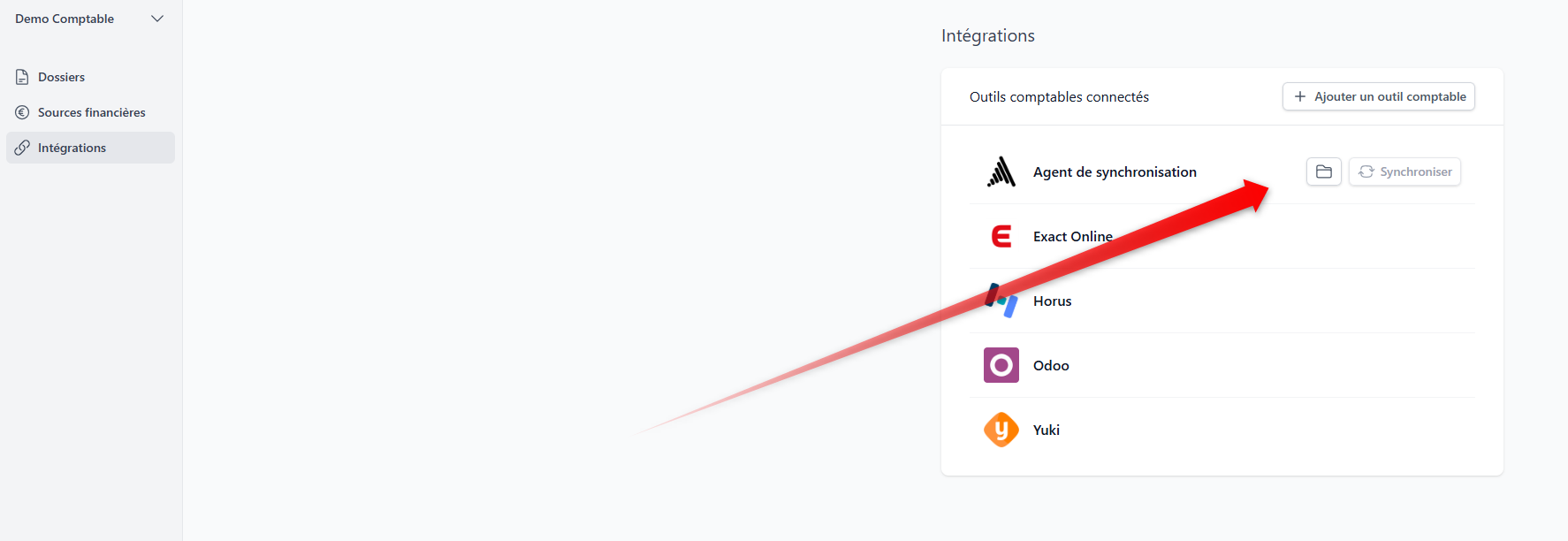 - Via le menu “Intégrations”, cliquez sur le bouton “Synchroniser”.