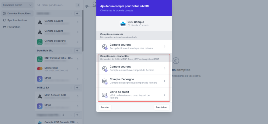 Les comptes non-connectés sont utilisés pour convertir des fichiers en CODA.