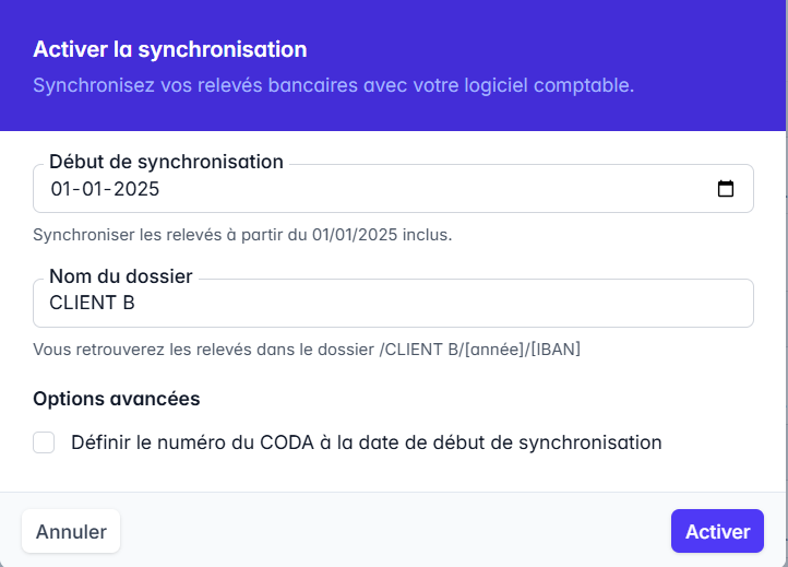 Si vous ajoutez un nouveau compte et que vous voulez récupérer immédiatement des CODA, utilisez la fonction Synchroniser maintenant.