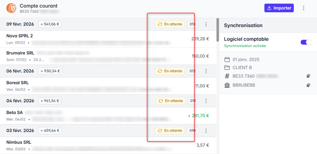 La section “Synchronisation” à droite de l’écran vous permet de facilement copier-coller l’IBAN et le BIC pour paramétrer votre logiciel comptable.