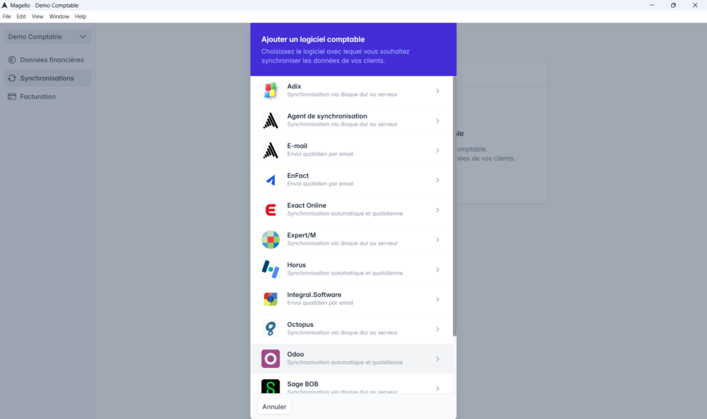 Seuls certains logiciels nécessitent l’installation du logiciel de synchronisation: Adix, Expert/M, Octopus, Winbooks, …
