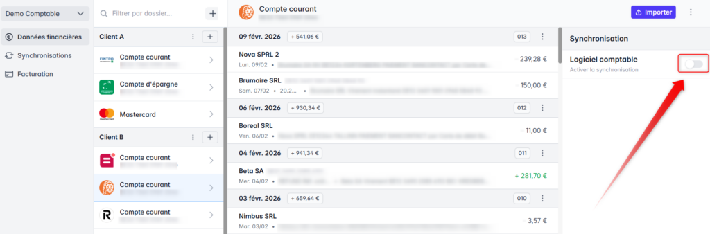 • Dans le volet à droite, activez la synchronisation vers votre logiciel comptable.